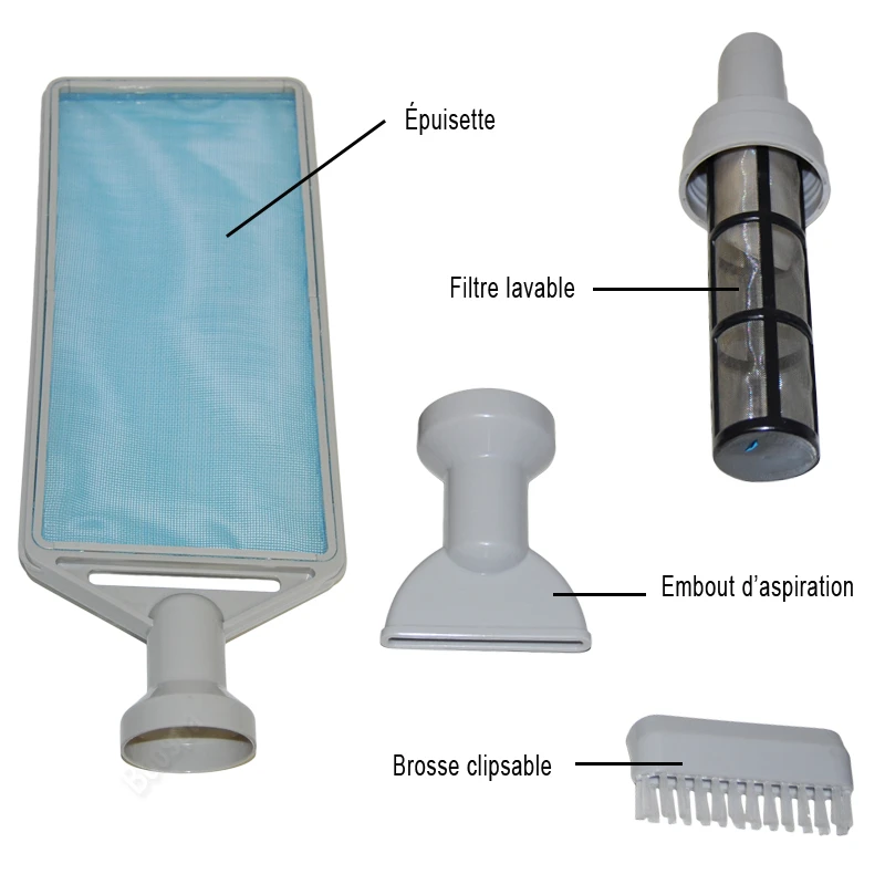 | L’épuisette Boospa vous permettra de retirer la majeur partie des débris présents dans l’eau de votre spa | La Brosse se fixe au bout de votre aspirateur. Elle peut ainsi décrocher les impuretés sur la parois interne de votre spa | L’embout large vous permet d’atteindre et d’aspirer les saletés se déposant dans le fond du spa. |