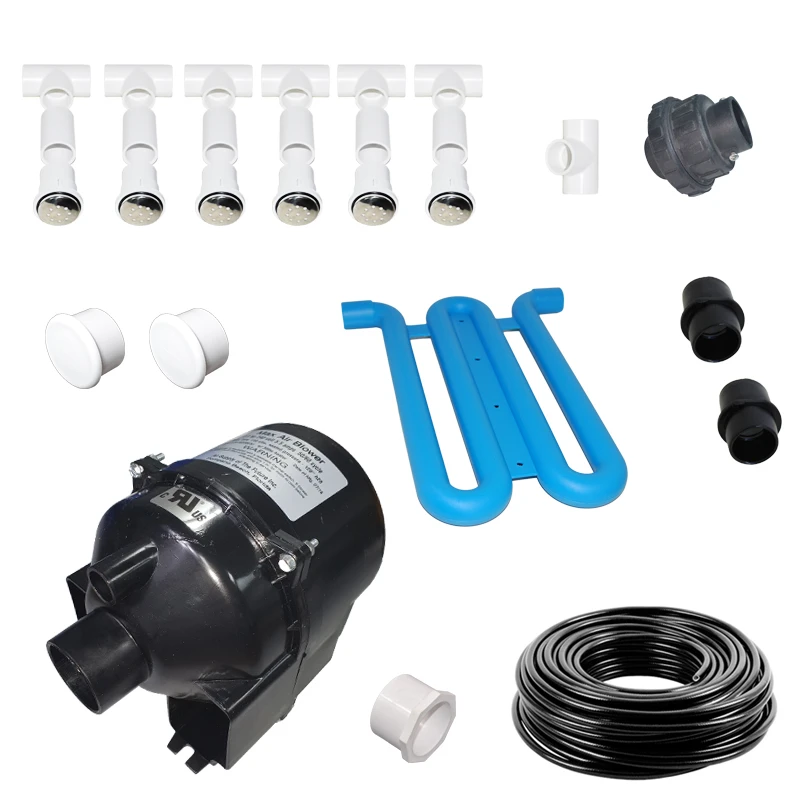 Comprend tout le nécessaire pour équiper un spa d’un système de buses d’air: Blower, tuyauterie, buses d’air et raccords.