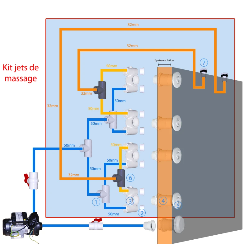 - Nous vous recommandons de bien équilibrer le circuit. Dans notre cas, le flux de la pompe est divisé en deux pour alimenter 2 x 2 jets