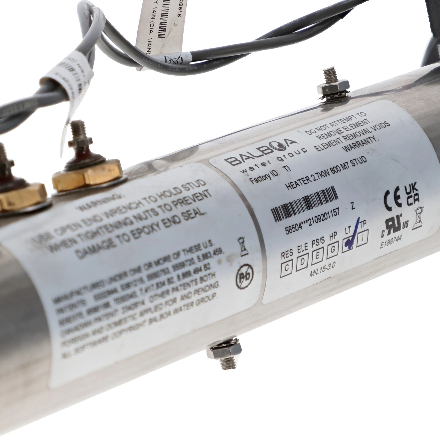 Le modèle 58504 de Balboa est équipé de 2 capteurs M7 30344 avec un câble d’une trentaine de centimètres. Ce réchauffeur de 2.7 kW est l’un des plus utilisés du marché et il est présent dans de nombreux boîtiers de contrôle. Il dispose d’une résistance Incoloy 800 et peut remplacer les réchauffeurs :